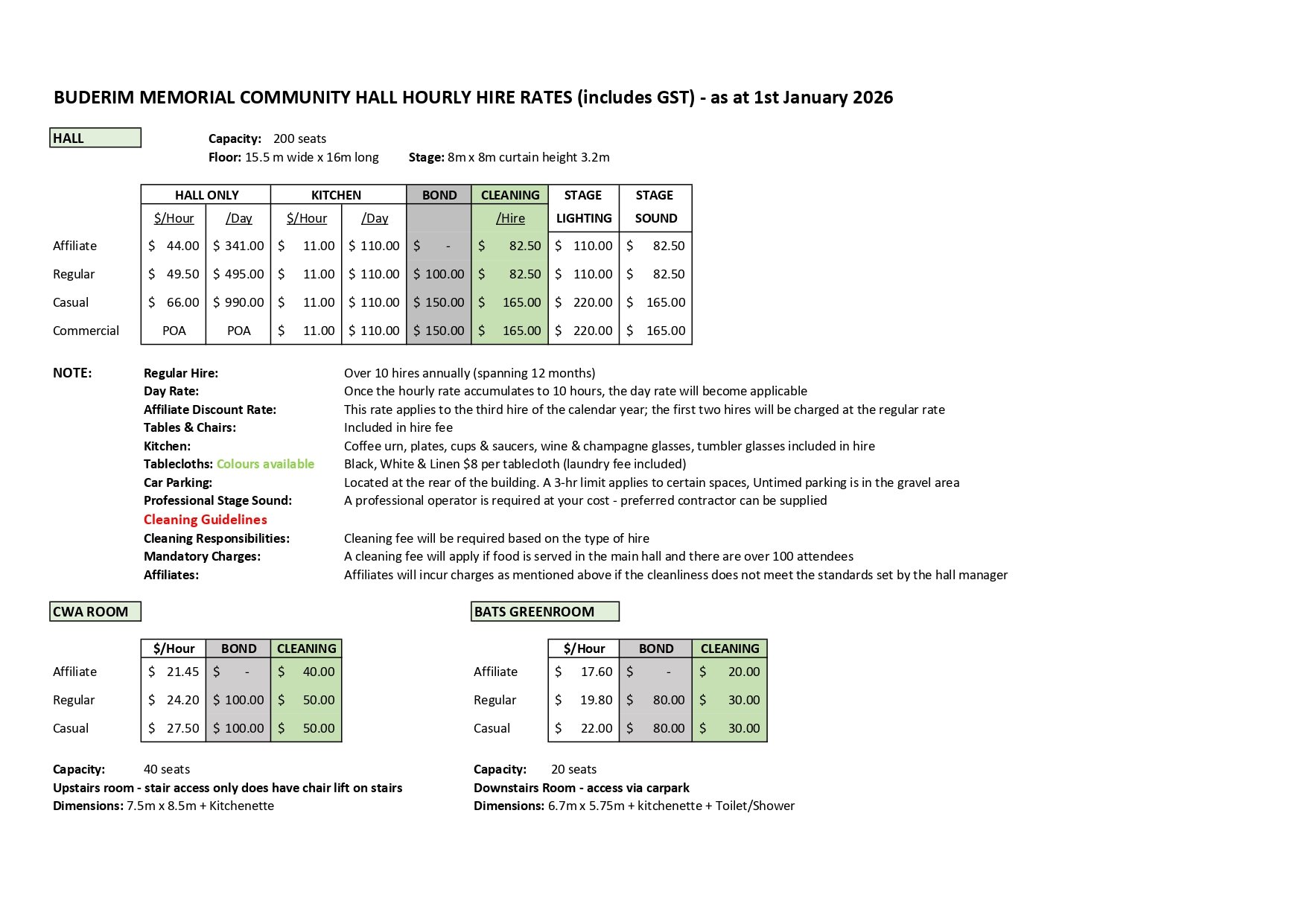 For information regarding hiring rates and bookings, please contact admin@bwmca.com.au